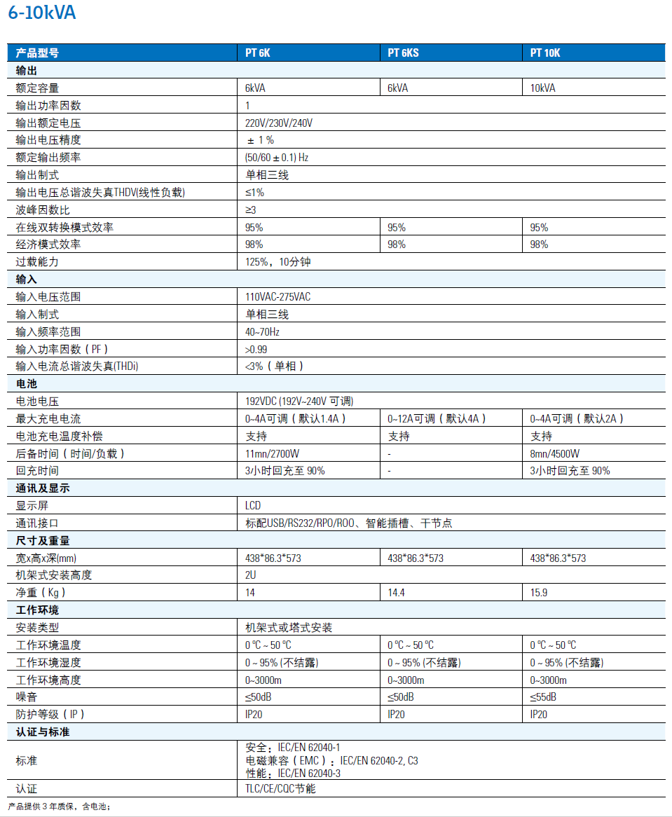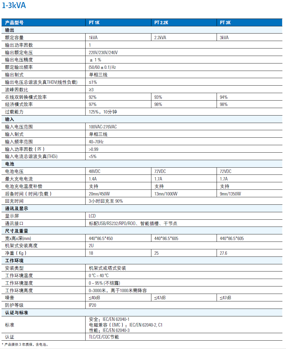 更高的效率,更小的體積。全系列輸出功率因數為1,10kVA雙轉換模式效率高達95%,機架式安裝時高度2U,深度小于600mm。